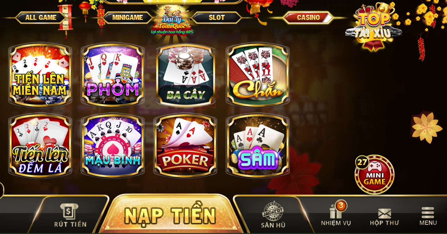 Thế giới game bài online hấp dẫn với những tựa game đã quá quen thuộc với người chơi. Tiến Lên Miền Nam, Phỏm, Chắn, Ba Cây, Tiến Lên Đếm Lá, Poker, Mậu Binh và Sâm. Mỗi game bài đều có hướng dẫn luật chi tiết với đa dạng mức cược, bàn chơi khác nhau tùy ý người chơi lựa chọn.